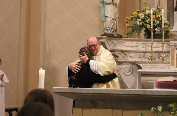 Logo depois, os pais do padre Volmir, Benjamin e Adelina, entregaram um presente na comemoração deste jubileu. Os catequizandos entregaram cartas de carinho ao pároco receberam um abraço e a bênção.