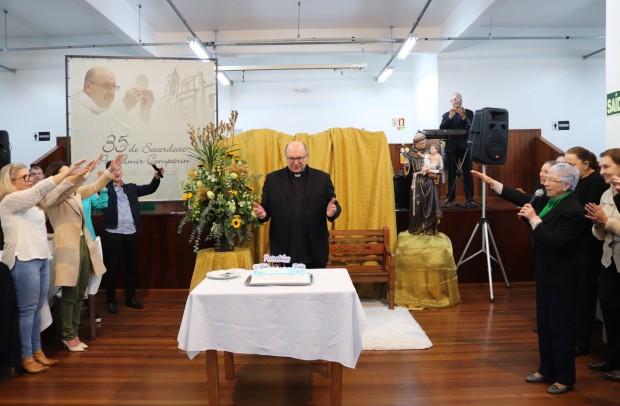 A Paróquia Santo Antônio de Bento Gonçalves celebrou, neste domingo, 03 de agosto, a Missa em ação de graças e o almoço de confraternização pelos 35 anos de sacerdócio do pároco, padre Volmir Comparin. Além do tempo de ministério presbiteral, em 2025 ele também comemora 60 anos de vida.